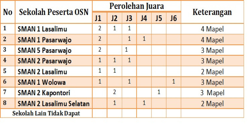 Dalam pengumuman yang dirilis oleh pihak Dinas Pendidikan dan Kebudayaan Provinsi Sulawesi Tenggara, urutan sekolah peserta KSN atau OSN tingkat kabupaten Buton, SMA Negeri 1 Lasalimu keluar sebagai peringkat I juara umum diikuti SMA Negeri 1 Pasarwajo peringkat II juara umum dengan perolehan masing-masing empat mata pelajaran, namun SMA Negeri 1 Lasalimu lebih unggul dengan juara I dua mapel, juara II satu mapel, dan juara III satu mapel. Sedangkan SMA Negeri 1 Pasarwajo mendapat juara I dua mapel, juara III satu mapel, dan juara IV satu mapel.